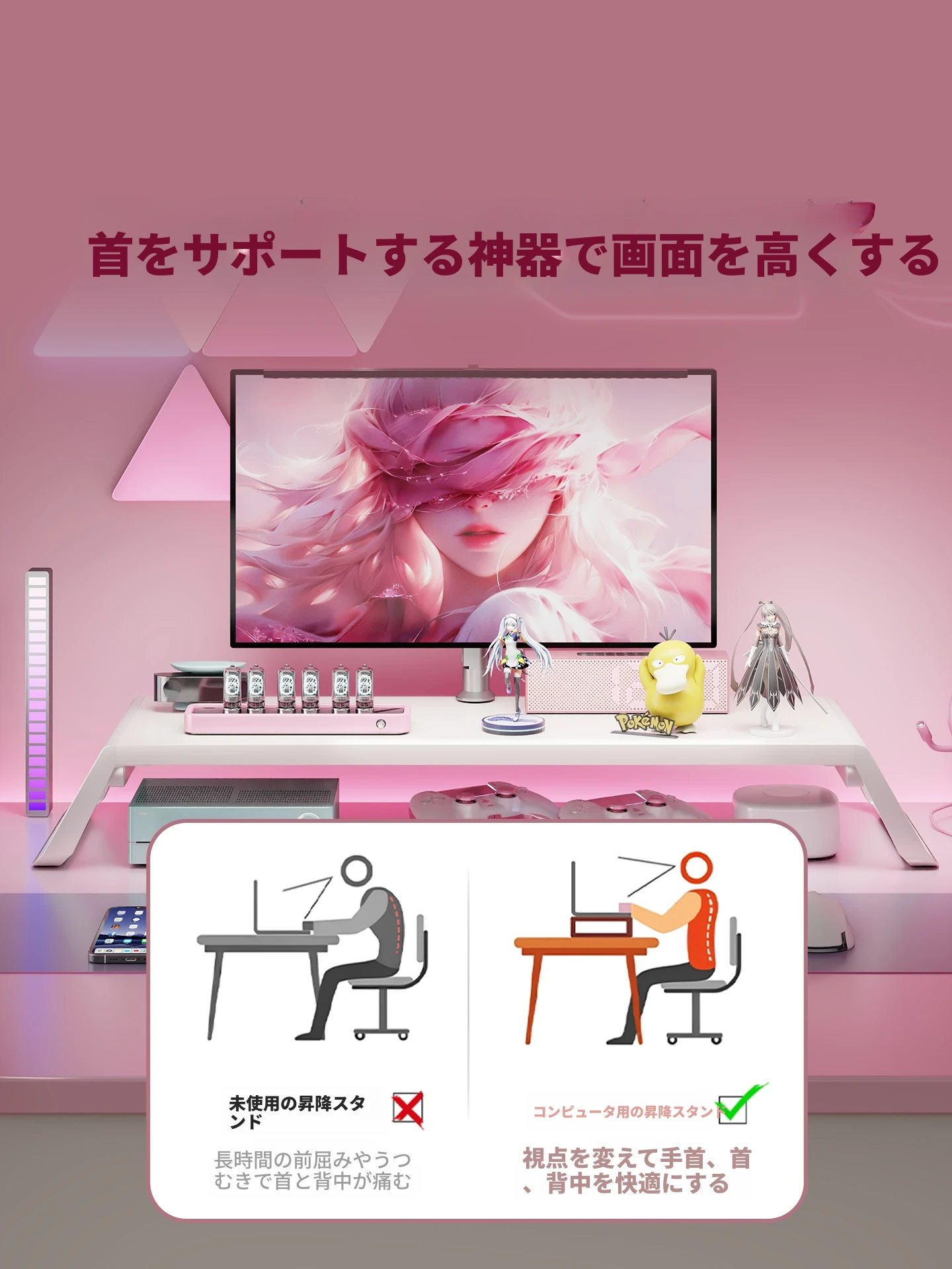 USB充電機能付き!デスク周りをスッキリ整理できる、女性向けパソコンスタンド。ノートパソコンやモニターを快適に支え、オフィスや家庭での作業効率をアップ!